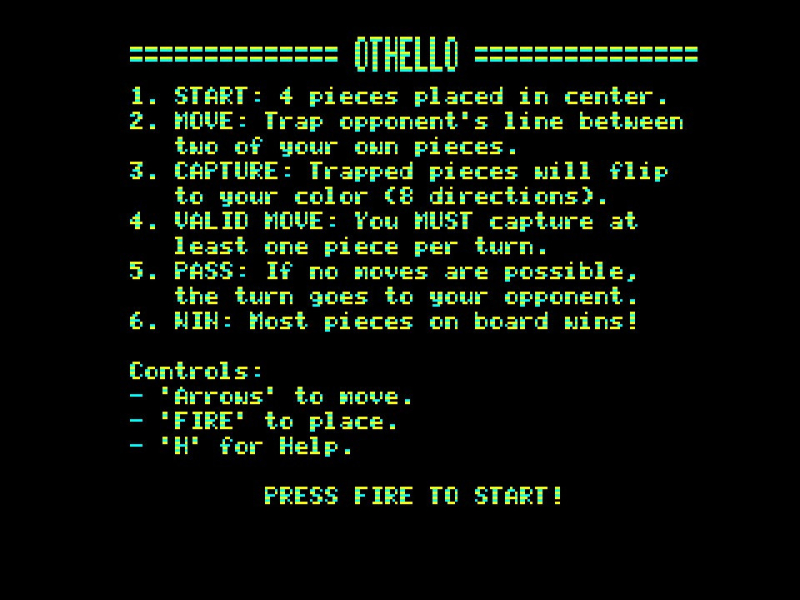 This version of Othello is adapted for the Oric platform, preserving the classic gameplay while optimizing visuals and performance to match the limitations of 8-bit hardware.